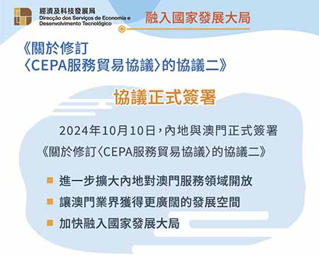 【特訊】今年是澳門回歸祖國25周年,本澳與內地簽署《關於修訂〈CEPA服務貿易協議〉的協議二》,協議將於明年(2025年)3月1日起正式實施,進一步深化兩地經貿交流合作,加快推動粵港澳大灣區建設,促進澳門經濟適度多元發展,並為澳門業界融入國家發展大局創設了更有利的條件。