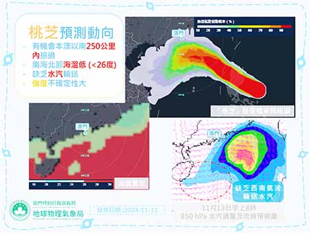 氣象局稱,按現時的資料預測,「桃芝」進入南海後將以西北方向移動及靠近華南沿岸,並可能於本週中後期(十三至十四日)在本澳以南約二百五十公里內掠過。但是,由於現時南海北部的海溫較低,同時已進入深秋,南海缺乏水汽向「桃芝」輸送,因此「桃芝」的強度變化仍存在較大的不確定性。氣象局將密切留意「桃芝」的發展動態,並適時向公眾發佈最新資訊。