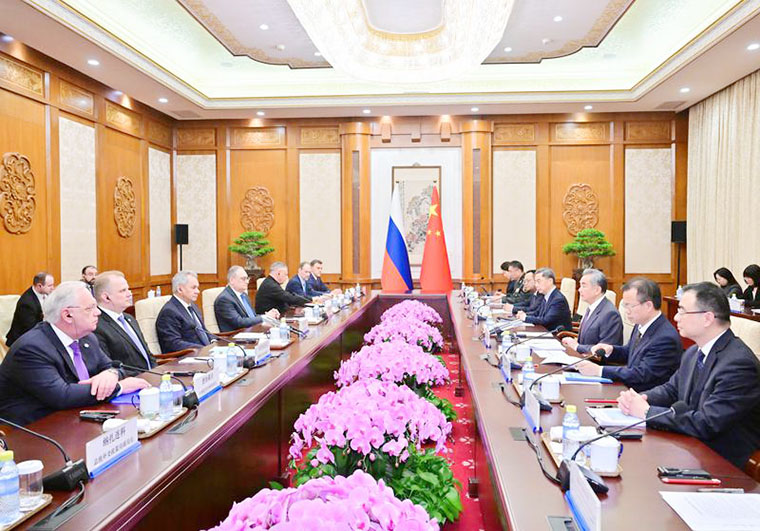 王毅說,今年是中俄建交75周年,習近平主席和普京總統年內三次會晤,對推動兩國關係乘勢而上、開拓進取作出一系列戰略部署。在兩國元首堅強領導下,中俄關係經受住國際風雲考驗,始終保持健康穩定發展勢頭。雙方秉持永久睦鄰友好、全面戰略協作、互利合作共贏原則,以服務兩國人民根本利益為己任,在涉及彼此核心關切問題上堅定相互支持,不斷深化政治互信,扎實推進務實合作,打造出相鄰大國關係的新范式,也為促進全球南方國家團結合作作出重要貢獻。