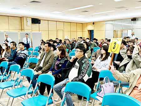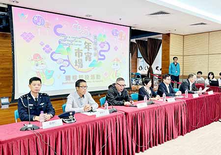 二零二五年度農曆春節年宵市場攤檔昨午於沙梨頭活動中心禮堂公開競投,市政署市政管理委員會委員吳秀虹、市政諮詢委員會委員胡景光、衛生監督廳廳長梁焯文、小販事務處代處長劉剛杰、經濟及科技發展局促進營商處處長劉傑麟、海關知識產權調查處關務督察區德仁列席主持。