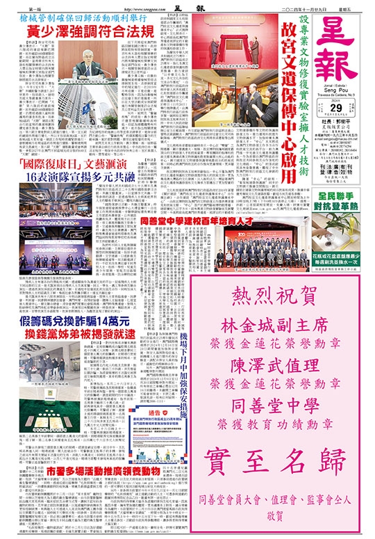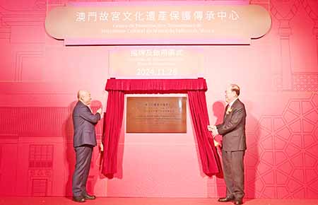 為慶祝中華人民共和國成立75周年、澳門特別行政區成立25周年,強化本澳文化遺產修復保護和教育推廣,助力建設“以中華文化為主流、多元文化共存的交流合作基地”,由澳門特別行政區政府與中華人民共和國文化和旅遊部合作籌建的“澳門故宮文化遺產保護傳承中心”,於昨日(11月28日)舉行揭牌儀式,由澳門特別行政區行政長官賀一誠與故宮博物院院長王旭東共同主持,中央人民政府駐澳門特別行政區聯絡辦公室主任鄭新聰、外交部駐澳門特別行政區特派員公署特派員劉顯法、澳門特別行政區政府社會文化司司長歐陽瑜、澳門特別行政區政府文化局局長梁惠敏等出席儀式。