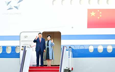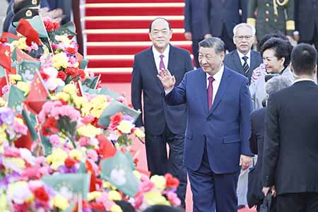 昨日下午四時許,中共中央總書記、國家主席、中央軍委主席習近平乘坐的專機徐徐降落在澳門國際機場。習近平和夫人彭麗媛走出艙門,向歡迎人群揮手致意。澳門警察樂隊奏響熱情洋溢的歡迎曲,舞龍舞獅表演喜氣歡騰。舷梯旁,兩名少年兒童向習近平和彭麗媛獻上鮮花。在澳門特別行政區行政長官賀一誠和夫人鄭素貞陪同下,習近平和彭麗媛同前來迎接的人員親切握手。數百名澳門青少年和各界群眾代表揮動國旗、特別行政區區旗和鮮花,表達熱烈的歡迎。