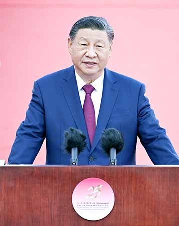 習近平表示,二十五年來,具有澳門特色的「一國兩制」實踐取得了舉世公認的成功,展現出勃勃生機和獨特魅力,國家的發展日新月異,勢不可擋。澳門的發展厚積薄發,未來可期。這是澳門居民的光榮,也是全國人民的驕傲。我相信只要充分發揮「一國兩制」的制度優勢,敢於拼搏,勇於創新,澳門一定能夠創造更加美好的明天。澳門是祖國的掌上明珠,我一直惦念著這裡的發展和全體居民的福祉。接下來幾天我會走一走、看一看,同各界朋友廣泛深入交流共商澳門發展大計,謝謝大家。