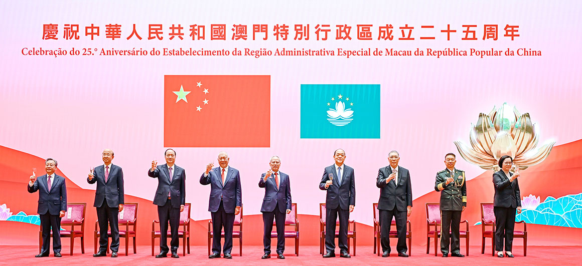 慶祝澳門特別行政區成立二十五周年招待酒會,於昨日下午五時三十分在中葡綜合體舉行,行政長官岑浩輝在會上致辭時稱,國家主席習近平視察澳門並發表系列重要講話,為澳門「一國兩制」實踐提出了新的要求,作出了新的部署。特區第六屆政府將帶領社會各界認真學習和貫徹落實習主席的系列重要講話精神,戮力同心,銳意進取,把習主席的親切關懷和殷殷囑托轉化為開創具有澳門特色的「一國兩制」實踐新局面的強大動力,決不辜負習主席和中央政府的信任和重託。