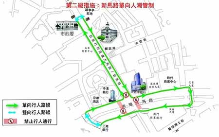 第二級措施:新馬路單向人潮管制。當第一級措施未能解決人群持續擠擁問題時,在第一級的基礎上,新馬路將實施單向人潮管制。行人需遵照附圖所示「倒T」字型單向行進路線前往議事亭前地、大西洋銀行、匯豐銀行、商業銀行、工商銀行、中國銀行及市政署等地點。