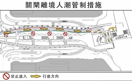 關閘人潮管制措施:當關閘離境大堂出現大量通關人士導致人潮擠擁時,將會實施人潮管制措施。關閘廣場風雨廊離境路段將實施「分流及分段放行」的措施,臨時封閉該走廊兩邊,在特定位置設立出入口,讓離境人士有序進入風雨廊輪候。口岸入境一側亦會因應人潮情況,在入境大堂前的行人走廊,實施「分流及分段放行」管制措施。