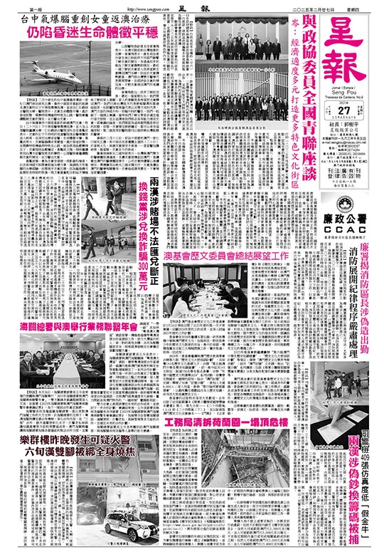 另外行政長官岑浩輝昨(廿六)日在中葡綜合體與中華全國青年聯合會澳區委員及澳門青年聯合會一行座談,就特區政府制定本年度施政方針聽取意見及建議。