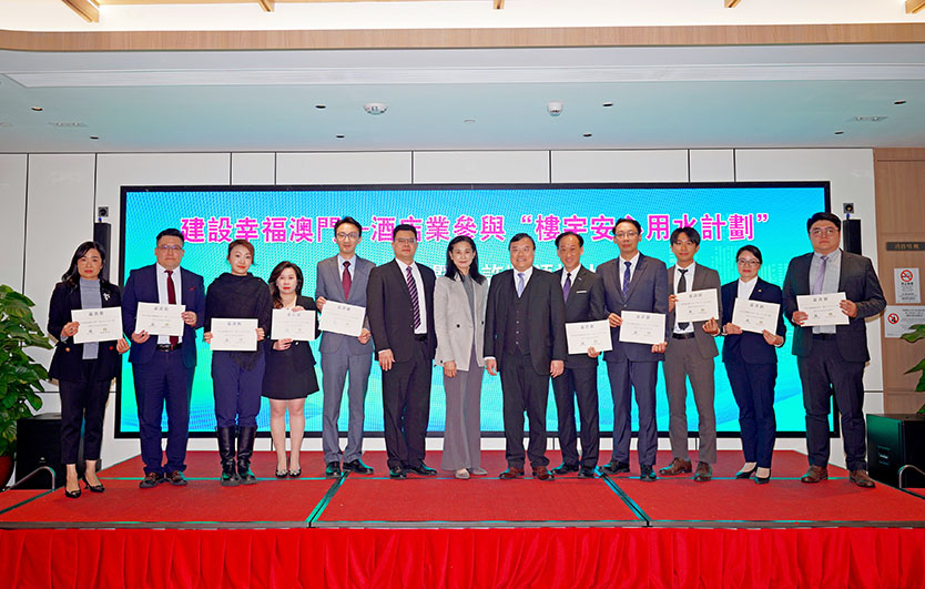 【特訊】為鼓勵本澳酒店業界參與“樓宇安心用水計劃”,海事及水務局與澳門酒店旅業商會於3月17日(周一)下午3時合辦「建設幸福澳門—酒店業參與“樓宇安心用水計劃”動員儀式暨嘉許狀頒授大會」,十間參與“樓宇安心用水計劃”的會員酒店獲頒發嘉許狀。