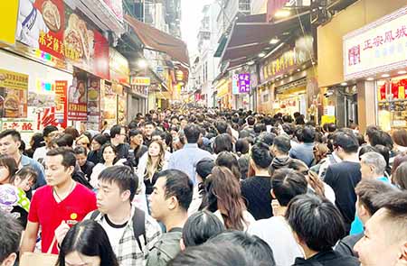 在氹仔官也街昨日人流如鯽,周邊街巷部分商戶出現排隊人龍,打卡位亦吸引不少旅客拍攝。有在街巷經營雜貨鋪的店主認為,人流雖有增加,但生意與平日週末相若,反映旅客消費力仍然較疲弱,他相信若天氣好,及後兩天區內人流有望進一步上升;手信店負責人亦認為,小長假暫時「旺丁不旺財」,大部分消費小食為主,買手信的旅客不多,希望當局推出如抽獎等措施刺激旅客多消費。