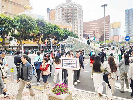 【特訊】清明節一連三天的小長假昨日(四日)開始,在大三巴一帶,人頭湧湧,大三巴街昨日下午實施人潮管制,有警員維持秩序。而氹仔官也街昨日人流如鯽,周邊街巷部分商戶出現排隊人龍,打卡位亦吸引不少旅客拍攝。治安警公布,清明節(四日)截至昨日下午九時,本澳各口岸出入境總人次六十二萬五千一百三十九人次,旅客佔約三十一萬八千二百三十六人次,當中入境旅客約 十六萬七千四百五十四人次,主要經關閘口岸,其次是港珠澳大橋口岸及橫琴口岸通關。