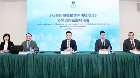 衛生局昨日(十六)日舉行新聞發佈會,宣佈於四月十七日至五月十六日期間就《私營醫療機構業務法律制度》展開為期三十天的公開諮詢,並舉辦五場公眾諮詢會。衛生局局長羅奕龍、仁伯爵綜合醫院醫務主任彭蓬光、醫務活動牌照處處長黃焯鵬、醫務委員會秘書長梁佩珊及衛生局法律辦公室協調員夏利樂共同出席了新聞發佈會。