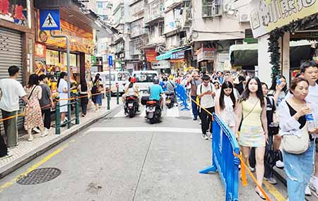另外,大三巴一帶於昨日下午一時多實施人潮管制,而新馬路由龍嵩正街至市政署部份車道亦在下午兩時多開始用作臨時行人通道,行經新馬路的車輛不可左轉入龍嵩正街,需取道傅禮士神父街。沙梨頭至新馬路一帶出現較長車龍,現場有警員疏導,車輛有序通行。