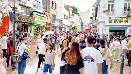 有商戶指出,昨天(2日)和前天差很遠,前日下了雨後,可能遊客去了大三巴那邊,沒有人來官也街,比新年的時候少了很多,少了一大截。看到現在的人流,開始有人出現了。今天到目前為止,生意額可以接受和昨天相差較大,消費意欲不多不少,天氣會影響到消費意欲,因為我的產品比較凍。