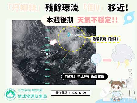 【特訊】氣象局表示,熱帶氣旋「丹娜絲」進入內陸後,預測將以「倒V」路徑靠近廣東內陸,隨著「丹娜絲」殘餘環流靠近,本澳今日起至週六(十日至十二日)初時驟雨頻密,累積雨量高,間中有大驟雨及雷暴。當局將密切監測動態,又提醒近年不時出現由熱帶氣旋殘餘環流引致的列車式暴雨,呼籲市民留意適時做好應對。