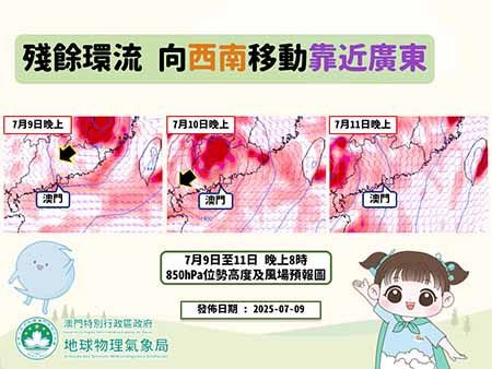 氣象局又稱,而現時不同模式之間仍有分歧,部份模式更預料「丹娜絲」殘餘環流會以較接近沿岸路徑靠近珠江口,有利其環流強度維持甚至再度增強,屆時對本澳造成的影響將更為明顯,氣象局將密切監測其動態。近年不時出現由熱帶氣旋殘餘環流所引致的列車式暴雨,氣象局提醒市民密切留意局方的最新天氣提示及警告,適時做好應對措施及調整出行安排。展望下週初,隨著低壓槽減弱,副熱帶高壓將會再次回歸,下週初天氣酷熱,仍有一兩陣驟雨。