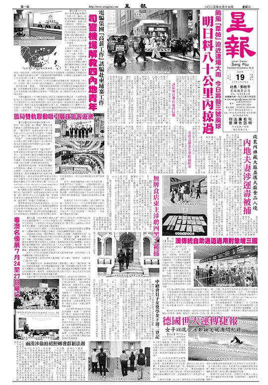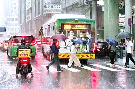 昨日(十八日)氣象局一度發出黃色和紅色暴雨警告信號,歷時兩小時十二分。氣象局表示,受高溫觸發的雷雨區影響,截至昨日傍晚 六時,大潭山氣象站錄得最高總雨量為六十七毫米,路環九澳氣象站六十三點二毫米;澳門半島外港和大炮台氣象站錄得最高總雨量為三十七點四毫米。至昨日下午,黃色高溫提示仍然生效,氣象局預料,受熱帶氣旋外圍下沉氣流影響,本澳今日(周六)天氣酷熱,多雲,短時間有陽光,有幾陣驟雨及雷暴,晚間雨勢漸漸頻密。週日(二十日)天氣不穩定,密雲,有驟雨及雨勢有時頗大,間中有雷暴,風力明顯增強。