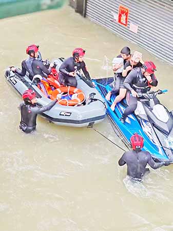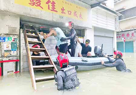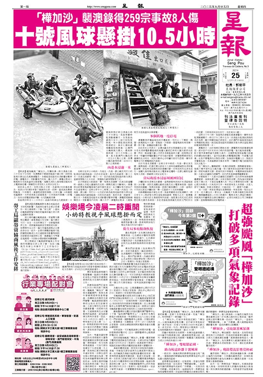 【特訊】超強颱風「樺加沙」吹襲本澳,昨日清晨五時三十分至下午四時,本澳懸掛十號風球超過十個小時,同時氣象局亦發出紅色風暴潮警告,多處低窪地區受水浸影響而暫停供電,澳電表示,受影響用戶約有一萬六千戶,澳電在取消八號風球及水退後盡快安排復電。海關及消防人員用橡皮艇和水上電單車巡邏,接載因水浸受困人士到安全地方。