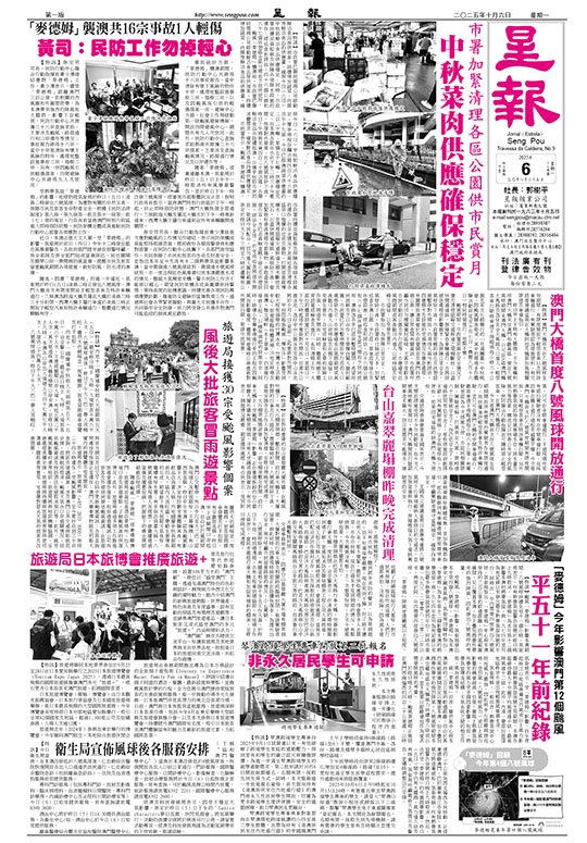 【特訊】市政署已聯同兩南公司啟動鮮活食品保供預案,持續增加蔬菜、肉類等鮮活食品的供應量,確保今日(六日)中秋節鮮活食品供應穩定。同時,市政署持續派員監察及保障各項排水設施的運作;經巡查和評估,四十六個公園和六十七個休憩區全部可開放予居民使用。