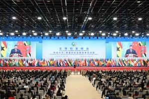 金秋時節,天朗氣清。國家會議中心會場內,各國國旗和聯合國旗幟組成恢弘旗陣。