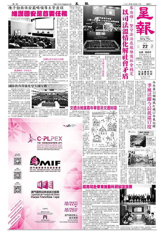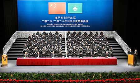 二零二五至二零二六年司法年度開幕典禮昨日舉行。出席的行政長官岑浩輝在致辭時表示,法治是社會穩定發展的基石。過去一年,澳門司法機關在維護司法公正、提高司法效率、完善司法制度等方面取得了扎實進展;當前,我們身處一個深刻變革的時代,內外環境日趨複雜,新發展、新問題、新變化不斷湧現,對司法工作提出了更高的要求。習近平主席多次強調「全面依法治國是國家治理的一場深刻革命。」這一論述不僅為國家全面依法治國赋予了光榮使命,也為澳門特區治理指明了方向,因此,我們要以更強的創新思維和更大的改革魄力,去把握機遇、迎接挑戰。