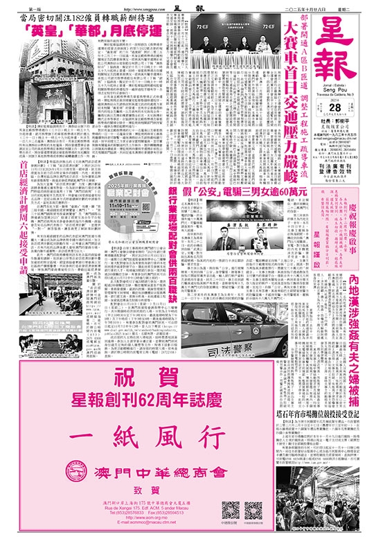 本澳十一月將接連舉行第十五屆全國運動會、第七十二屆格蘭披治大賽車,以及澳門戶外表演區多項活動,本澳多處將分階段實施臨時交通安排,預料部份區域屆時交通繁忙。為配合活動及保障公眾出行,政府多個部門透過協作部署相應安排,包括於大賽車前開通B匝道、調整部份道路工程的施工安排以釋放路面空間等;而交通事務局亦就上述活動開設專頁詳列相關臨時交通措施,呼籲公眾留意及瀏覽專頁獲取相關資訊。