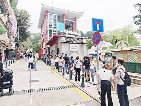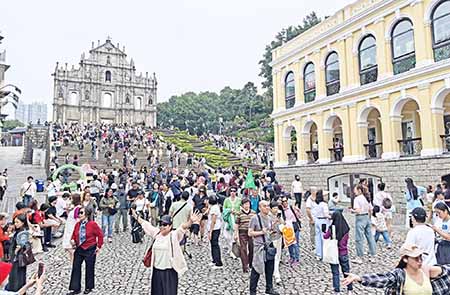 昨日大三巴牌坊及議事亭前地一帶,人流暢旺,不少旅客遊覽牌坊及大炮台,沿途的手信店亦門庭若市,擠滿購買手信的旅客,有手信店表示,昨日購買顧客以香港旅客為主,生意理想;有香港旅客稱早上來澳探親,下午買些手信回港給家人,近兩年的重陽節都是來澳探望親友。有珠海旅客稱,趁假期來澳遊覽一下,主要購買小食品嚐及日用品回家。