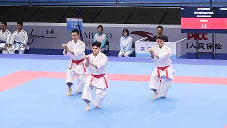 群眾項目空手道是澳門賽區首個開賽項目,一連三日在綜藝館舉行,昨天首日有男子業餘組團體型和組手女子公開組六十一以上公斤級這兩個項目,其中昨日早上率先上演男子業餘組團體型,澳門派出方文浩、郭建恆和鄭沘珞出戰這個項目,首場對北京,紅方的澳門率先亮相,表現「敖漢」型套路,有四位裁判都給予八分或以上,結果澳門獲得三十九點七分,以四點四分優勢擊敗北京晉級。