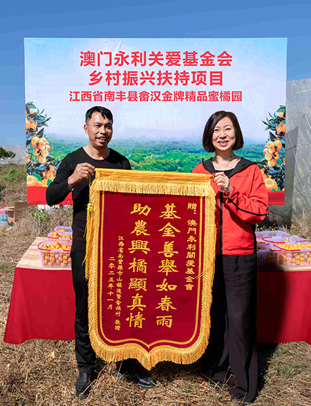 永利自 2023 年開始長期通過多項舉措支持江西鄉村振興,依托自然資源發展特色產業,推動地區實現高質量發展。如先後援建升級了修水縣豆制品加工廠、南豐縣蜜橘種植園、南城縣薯粉制品加工廠等項目,以此響應國家鄉村振興政策。畬漢金牌精品蜜橘園占地 50 餘畝,通過打造精心管理的南豐蜜橘採摘園及精品小康園,促進了地方經濟增效與生態環境保育的雙重實踐。適逢第十七屆江西南豐蜜橘文化旅遊節開幕,南豐縣市山鎮進賢畲族村黨支部書記、村委會主任劉春根陳志玲主席致送錦旗,感謝永利關愛基金會對南豐蜜橘的大力支持,助力宣傳南豐蜜橘,讓甜蜜走向澳門、走向世界。