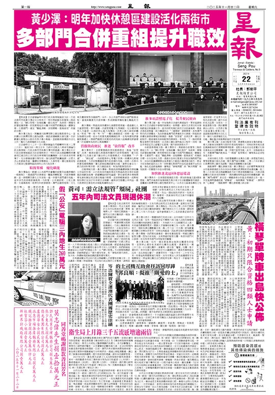 【特訊】立法會辯論明年度行政法務領域施政方針,行政法務司司長黃少澤在引介時表示,明年將啟動市政署第二階段重組,以“歸口管理、加強統籌、簡化程序”為原則,精簡市政署組織架構,把性質相近但分屬不同部門的職能統一劃歸至單一主責部門,達至“職能清晰、流程順暢、服務高效”的施政目標。