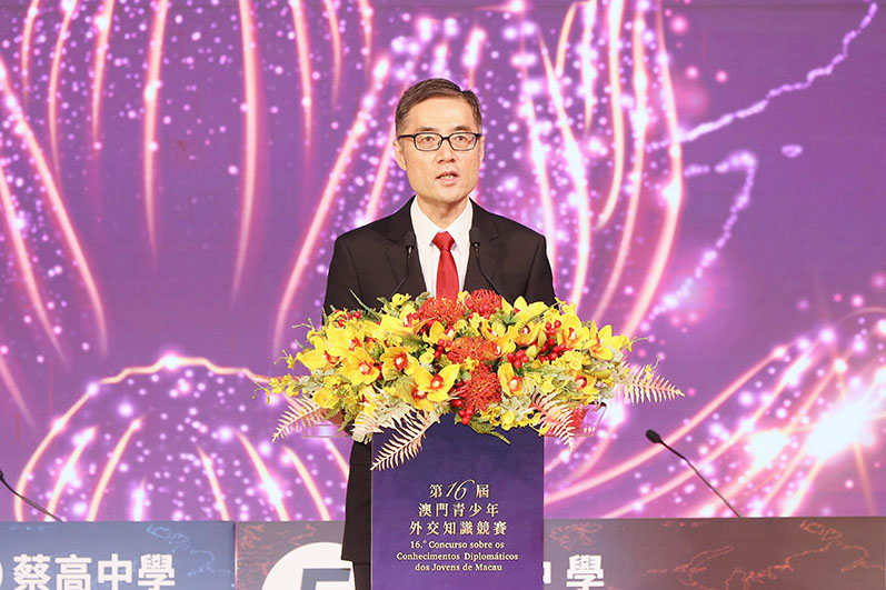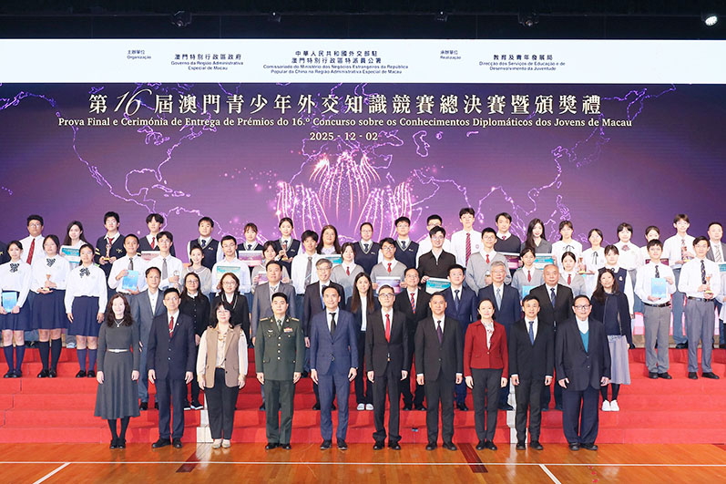 【特訊】由澳門特別行政區政府與中華人民共和國外交部駐澳門特別行政區特派員公署主辦、教育及青年發展局承辦的第16屆澳門青少年外交知識競賽總決賽暨頒獎禮於12月2日舉行。競賽綜合考驗參賽學生對習近平外交思想、中國特色大國外交、涉澳外交、外交史、外交常識、時政熱點等的掌握和運用,得到特區社會各界廣泛支持。本屆參與的學校共37所,學生人數超過 9,000人,由推廣賽、初賽到脫穎而出進入總決賽的8支隊伍,經過一輪緊張的外交知識較量,最終由鏡平學校獲得冠軍,濠江中學、聖公會(澳門)蔡高中學、教業中學分別獲亞軍、季軍和殿軍,澳門大學附屬應用學校、培正中學、勞校中學、粵華中學獲優異獎。