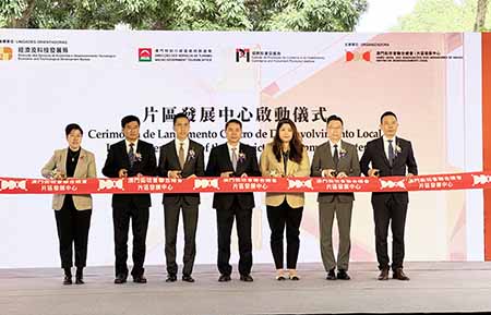 片區發展中心啟動儀式昨日在媽閣塘片區大鐵棚舉行,由中聯辦副秘書長黃華蓋、經濟及科技發展局局長邱潤華、旅遊局代局長司徒琳麗、中聯辦經濟金融部副部長楊全州、招商投資促進局主席謝永強、街總會長吳小麗及理事長陳家良等主禮。