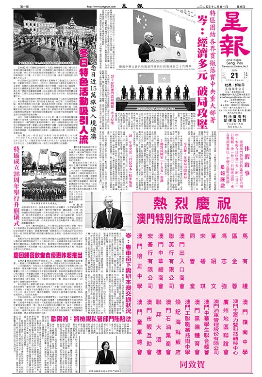 【特訊】特區政府昨日(二十)日舉行慶祝中華人民共和國澳門特別行政區成立二十六周年招待酒會。行政長官岑浩輝致辭時表示,二十屆四中全會擘畫了國家發展的新藍圖,中央「十五五」規劃建議對澳門未來發展作出了重要戰略部署,為特區發展提供了新的巨大機遇和政策動能。