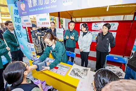 隨後,一眾嘉賓前往現場設立的“健康加油站”,了解運作情況並與居民互動交流,氣氛熱烈。“健康加油站”首階段活動於1月12日至3月31日期間,逢星期一至五(政府假日、惡劣天氣及維護期間除外)上午8:00至10:00及下午16:30至18:30,於紀念孫中山市政公園、白鴿巢公園、綠楊花園休憩區、華士古達嘉馬花園、永寧廣場休憩區、宋玉生公園、加思欄花園及氹仔奧林匹克大馬路休憩區共八個站點同步開展,敬請留意開放時間。各站配有“健康加油站”橫額,工作人員亦會佩戴相關胸針,以便居民識別。文化局、體育局及衛生局將分別派出“文化傳播員”、“健身指導員”及“健康促進員”,為居民提供文化活動指導與資訊、個性化科學運動指導、免費血壓測量、健康資訊與評估,並協助預約衛生中心醫療服務,包括疾病篩查、疫苗接種、心理評估等多項內容。