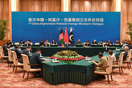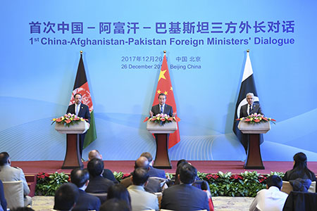 【中新社北京12月26日電】(記者 余湛奕)首次中國-阿富汗-巴基斯坦三方外長對話26日在北京釣魚台國賓館舉行。中國外交部長王毅主持對話,阿富汗外長拉巴尼、巴基斯坦外長阿西夫出席。