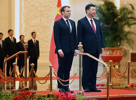 會談前,習近平在人民大會堂北大廳為馬克龍舉行歡迎儀式。習近平主席夫人彭麗媛,中共中央政治局委員、國務委員楊潔篪,全國人大常委會副委員長陳竺,全國政協副主席林文漪等參加。