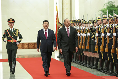 會談前,習近平在人民大會堂北大廳為圖普六世舉行歡迎儀式。習近平主席夫人彭麗媛,中共中央政治局委員、國務委員楊潔篪,全國人大常委會副委員長張平,全國政協副主席陳曉光等參加。