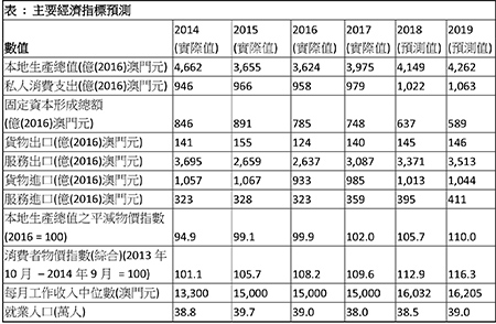 由澳門大學經濟學系及澳門研究中心公佈的2019年宏觀經濟預測顯示,澳門經濟在2018年上半年持續強勁,按所收集的數據分析,本地生產總值第1季按年增長9.4%,第2季按年增長5.9%。9月份颱風“山竹”衝擊澳門,令經濟增長急速下跌,本地生產總值第3季按年增長只有1.6%,達到1,009億澳門元。與美國的貿易摩擦及其他結構調整對中國經濟所帶來的負面效果在過去數個月逐步浮現,各種不穩定因素將會持續影響澳門經濟,因此,對澳門經濟增長預測向下修訂。