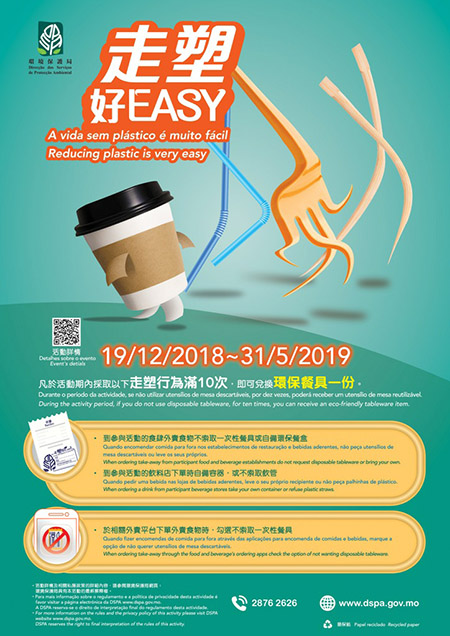 特區政府以促進人與自然和諧,建設生態文明城市為施政重點之一,並致力推動「源頭減廢,資源回收」,持續推動減塑工作,除了已就「膠袋收費」進行立法外,亦持續開展宣傳教育,包括已連續六年舉行的「減塑有著數」活動,累計參與人次超過26萬,至少減用了26萬個膠袋。同時,環保局與社團、外賣平台(平台內合作商戶約1,300家本地食肆及飲料店),以及近200家本地食肆及飲料店合作推出「走塑好Easy」活動。另外,特區政府正推動在會議中不使用瓶裝水,環保局並與治安警察局合作為前線警員提供耐用水樽;同時,正逐步在公共設施設置飲水機,並已推出設置和使用飲水機的指引,環保局亦與社團合作豐富斟水地圖、在大型活動推動「斟水」文化。
