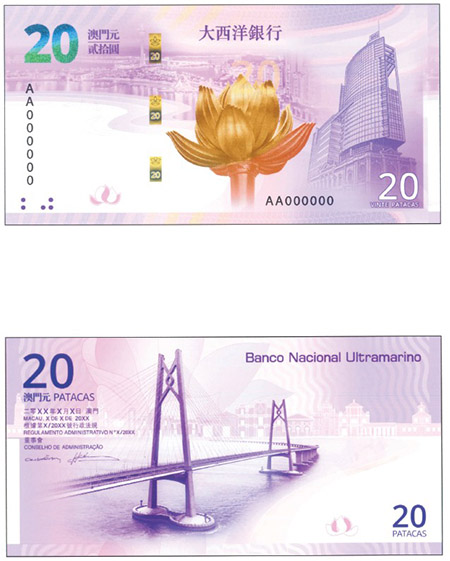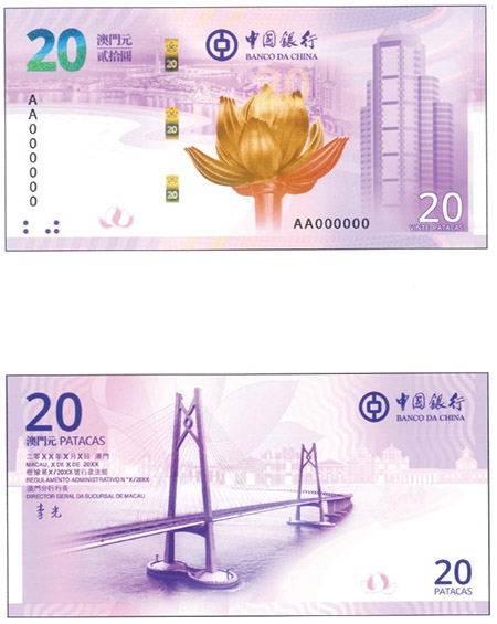 據稱,鈔票正面以「盛世蓮花」雕塑為主景,雕塑旁矗立發鈔銀行的大樓,體現發鈔銀行與澳門特區共同成長,輔景為澳門海岸的全景;鈔票背面以「港珠澳大橋」的「中國結」塔橋為主景,象徵澳門特區與中國內地經濟文化的溝通,輔景採用澳門歷史城區建築物組成,展現澳門特區獨特的歷史背景與文化魅力。草案建議自公佈翌日起生效。