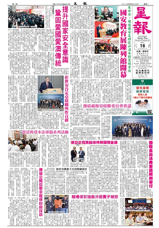 國務院港澳事務辦公室副主任宋哲致辭時表示,根據國家憲法和澳門特別行政區基本法,維護國家安全是澳門特區的職責,也是每一位澳門居民的應有義務。值得肯定的是,澳門特區政府和社會各界人士堅決維護國家主權、安全及發展利益,早在二○○九年就完成了以禁止危害國家安全行為作為主要內容的澳門基本法第廿三條本地立法,去年澳門又設立維護國家安全委員會,以及成功舉辦了國家安全教育展。他強調,事實證明,國家安全,澳門才能安全,才會有澳門的繁榮發展和市民的安居樂業,才能確保「一國兩制」事業在澳門行穩致遠。