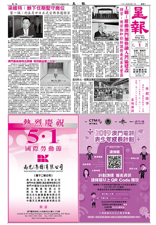 【特訊】工聯昨日舉行慶祝五一國際勞動節酒會,行政長官崔世安表示,堅持推進「一國兩制」、「澳人治澳」、高度自治的偉大實踐,是勞動權益和發揮勞動能量的最佳選擇。他稱,在推進科技創新的進程中,特區政府加快經濟結構的調整,用改革帶動多元就業,健全勞動關係的配套法律法規,打擊非法工作,保障僱員合法權益,並認為大家要用勞動和創新讓發展成果更加豐盛。工聯會長陳錦鳴則期望在特區政府帶領下、以勞動者為主體的澳門社會,能夠把握機遇、提升素質、發揮所長,為勞動者個人、為澳門創設嶄新未來。