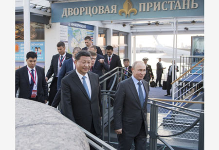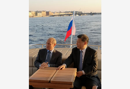 普京邀請習近平共同乘船遊覽涅瓦河。普京歡迎習近平再次到訪他的家鄉,並向習近平介紹聖彼得堡的風土人情和沿途建築。習近平表示,很高興訪問普京總統的家鄉聖彼得堡。這裡景色優美,文化藝術氛圍濃厚。這片文明沃土曾發生過許多重大歷史事件,孕育培養了大批傑出人物,特別是為世界反法西斯戰爭勝利付出了巨大犧牲,做出了重要貢獻,是俄羅斯和俄羅斯人民的驕傲。