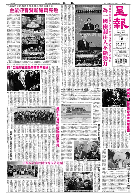 【特訊】中央人民政府駐澳門特別行政區聯絡辦公室昨日下午在旅遊塔會議中心舉方二○二○年新春酒會,中聯辦主任傅自應致辭時表示,愛國愛澳是澳門社會的核心價值,也是一國兩制在澳門成功實現的關鍵所在,未來要大力弘揚愛國愛澳傳統,不斷壯大愛國愛澳的力量,加強對青少年的教育培養,在愛國愛澳旗幟下實現最廣泛的團結。行政長官賀一誠在致辭時表示,面對動盪不安的周邊形勢,澳門社會各界團結一心,自覺守護「不能亂」的底線,共同維護大局穩定。