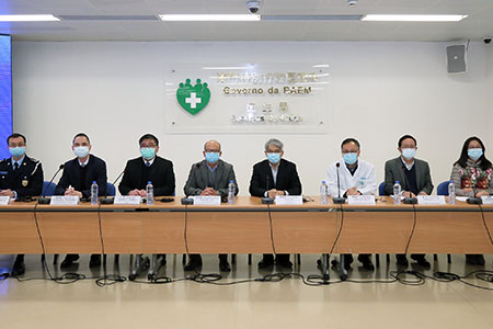 新型冠狀病毒感染應變協調中心昨日舉行「新型冠狀病毒最新情況及本澳各項防控措施」記者發佈會,衛生局局長李展潤、高等教育局代局長曾冠雄、仁伯爵綜合醫院醫務主任李偉成、疾病預防控制中心主任林松、旅遊局執照及監察廳廳長陳露、教育暨青年局廳長教育廳江毅、博彩監察協調局幸運博彩監察廳廳長黃志富、治安警察局居留及逗留事務廳代廳長黃劍虹共同會見傳媒。