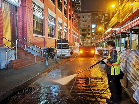 市政署除以稀釋的漂白水清洗小販區、街市及澳門批發市場周邊的公共街道,同時亦加派了人員對場內的設施設備進行清抹及消毒工作,並呼籲小販保持小販區內的環境衛生,切勿胡亂棄置垃圾,以確保相關場所衛生供市民使用。