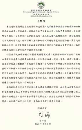 「本澳近期遭受新型冠狀病毒性肺炎侵襲,民眾健康和公共安全秩序正面臨極其嚴峻的威脅。因應疫情,特區政府做了大量的工作、採取了多項措施,旨在保障公共衛生、公共安全和社會民生穩定,在此本人謹代表特區政府,衷心感謝廣大市民對政府抗疫工作的理解、支持和配合,同時也要感謝全體公務人員在這段期間的辛勞,特別是醫護人員以及保安部隊和保安部門前線人員緊守崗位、為民眾健康福祉和社會安定所作出的無私奉獻。