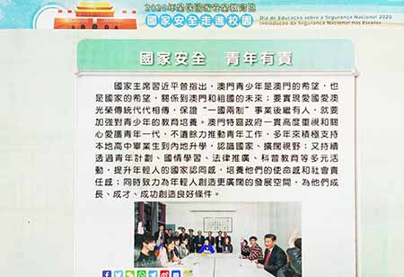 【特訊】昨日(十五日)是全民國家安全教育日,為了加深全澳市民尤其是青年學生對國家安全的認識,瞭解國家安全的重要性,從而支持和配合維護國家安全的工作,特區政府將舉辦「國家安全走進校園」網絡圖片展,於昨日上午九時開通,內容圍繞國家和澳門在維護國安的法制、一國兩制等,希望增加市民,尤其是青年學生對國家安全的認識。