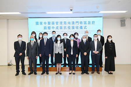 國家中醫藥管理局透過澳門紅十字會協助運送1,500盒“金花清感顆粒”、1,000盒“藿香正氣軟膠囊”、3,500盒“疏風解毒膠囊”,透過冠華行協助運送800盒“連花清瘟膠囊”至澳門,合共捐贈6,800盒中成藥。連花清瘟膠囊、金花清感顆粒、疏風解毒膠囊和藿香正氣軟膠囊四款中成藥已獲國家藥品監督管理局批准註冊,並被納入國家“新型冠狀病毒肺炎診療方案”,主要用於醫學觀察期且出現乏力伴胃腸不適或伴發熱的病人的症狀改善,在國內的疫情防控中,上述中成藥已被證實具有緩解症狀及減輕病症發展的效用。倘有需要,衛生局的中醫生會為相關病人開處上述中成藥。