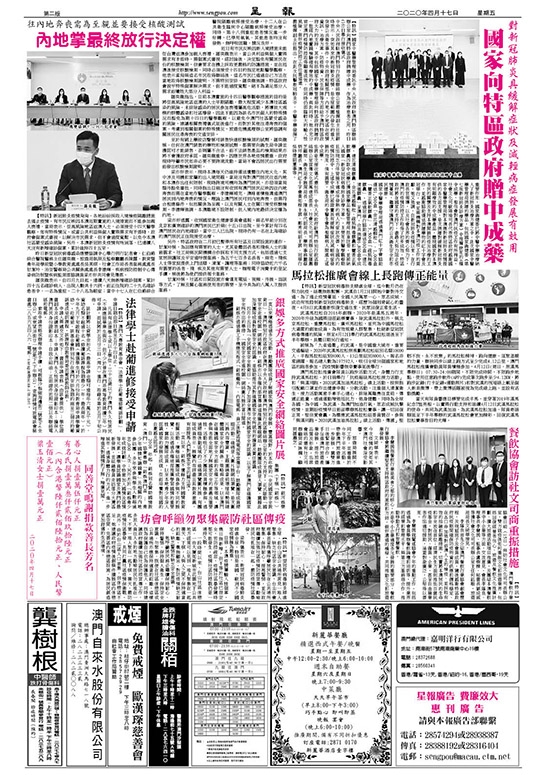 社會文化司歐陽瑜司長代表特區政府感謝國家中醫藥管理局對本澳應對新冠肺炎疫情提供的各方面支援,是次捐贈對緩解新冠肺炎有明顯療效的中成藥產品,體現國家對本澳市民的關懷及支持本澳開展防疫及治療的工作,並感謝協助運送捐贈藥物的紅十字會及冠華行,肯定兩機構對本澳防疫工作的貢獻。她又強調,自新冠肺炎疫情以來,在行政長官領導,以及社會各界的齊心努力下,澳門的疫情防控工作取得了初步成效。特區政府將在國家的支持下,盡最大努力阻止疫情蔓延,繼續守護澳門的公共衛生安全和市民健康。