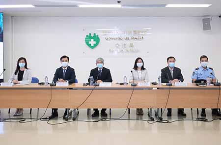 昨日新型冠狀病毒感染應變協調中心舉行例行記者會,李展潤、仁伯爵綜合醫院醫務主任羅奕龍、旅遊局執照及監察廳廳長陳露、高等教育局高等院校學生廳廳長陳旭偉、治安警察局行動及通訊處處長馬超雄、疾病預防控制中心傳染病防制暨疾病監測部協調員梁亦好共同會見傳媒。